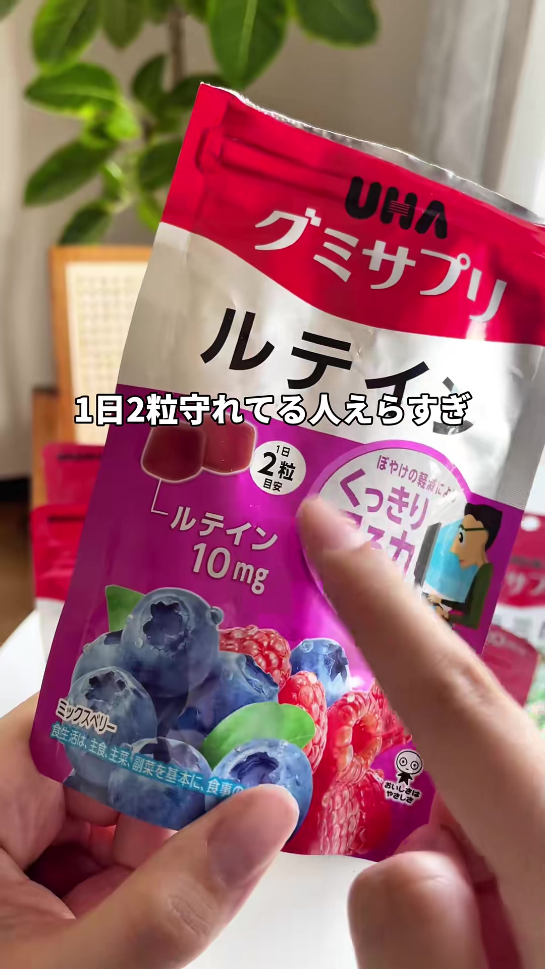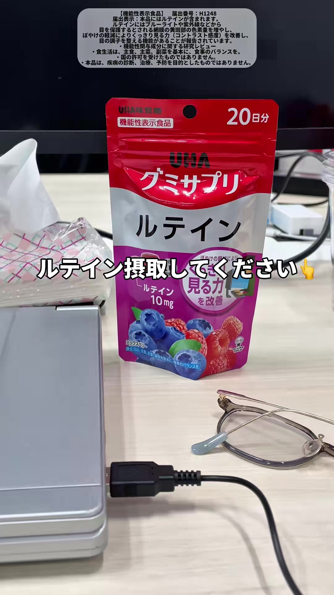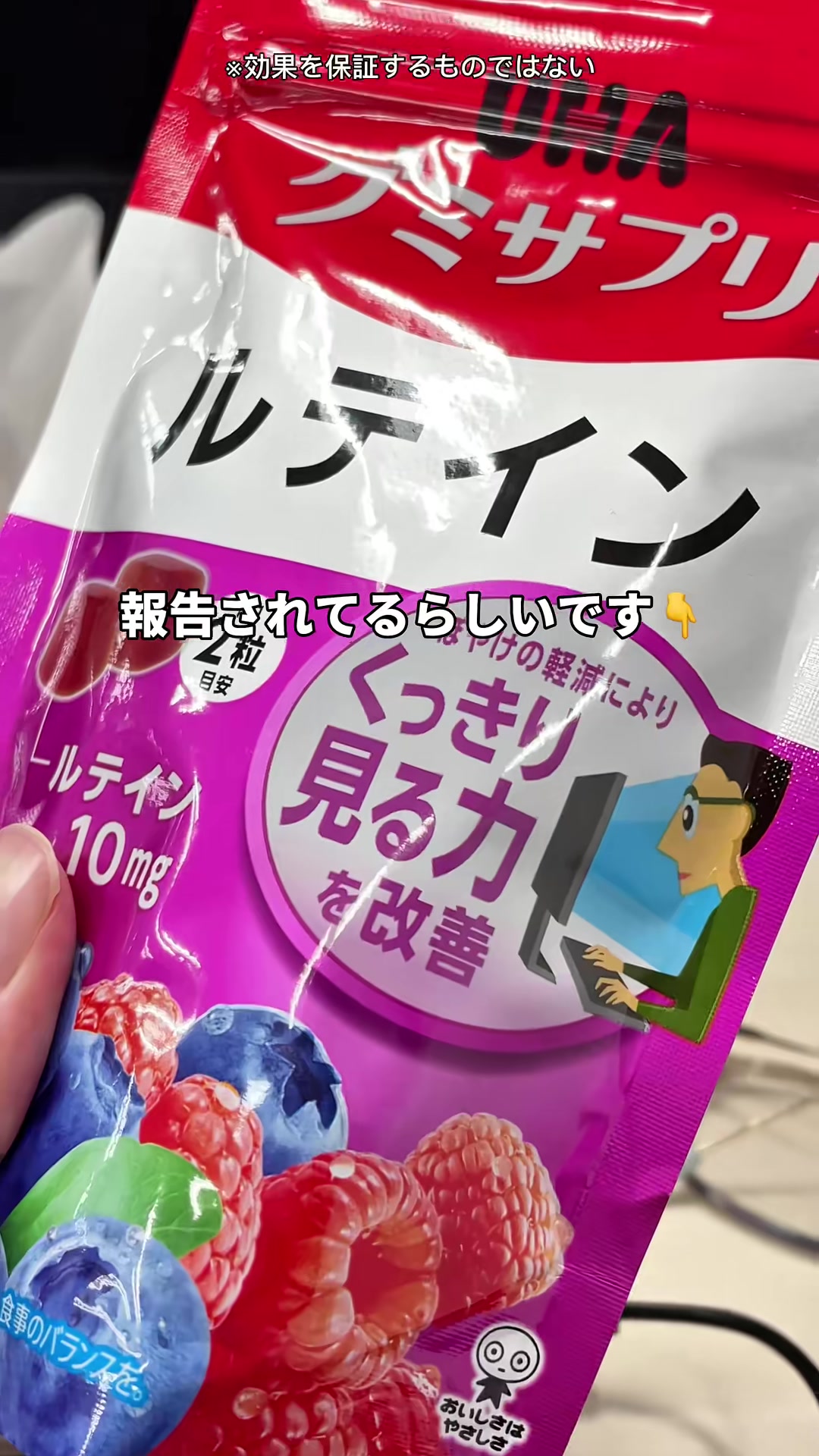 | 12-18秒 | 成分説明のテロップ | ルテイン + ゼアキサンチン配合 | 論文で効果が報告されたルテインとゼアキサンチンが入ってて、 | テロップメインのカット。手書き風フォント維持。成分名は黄色ハイライト。 | |