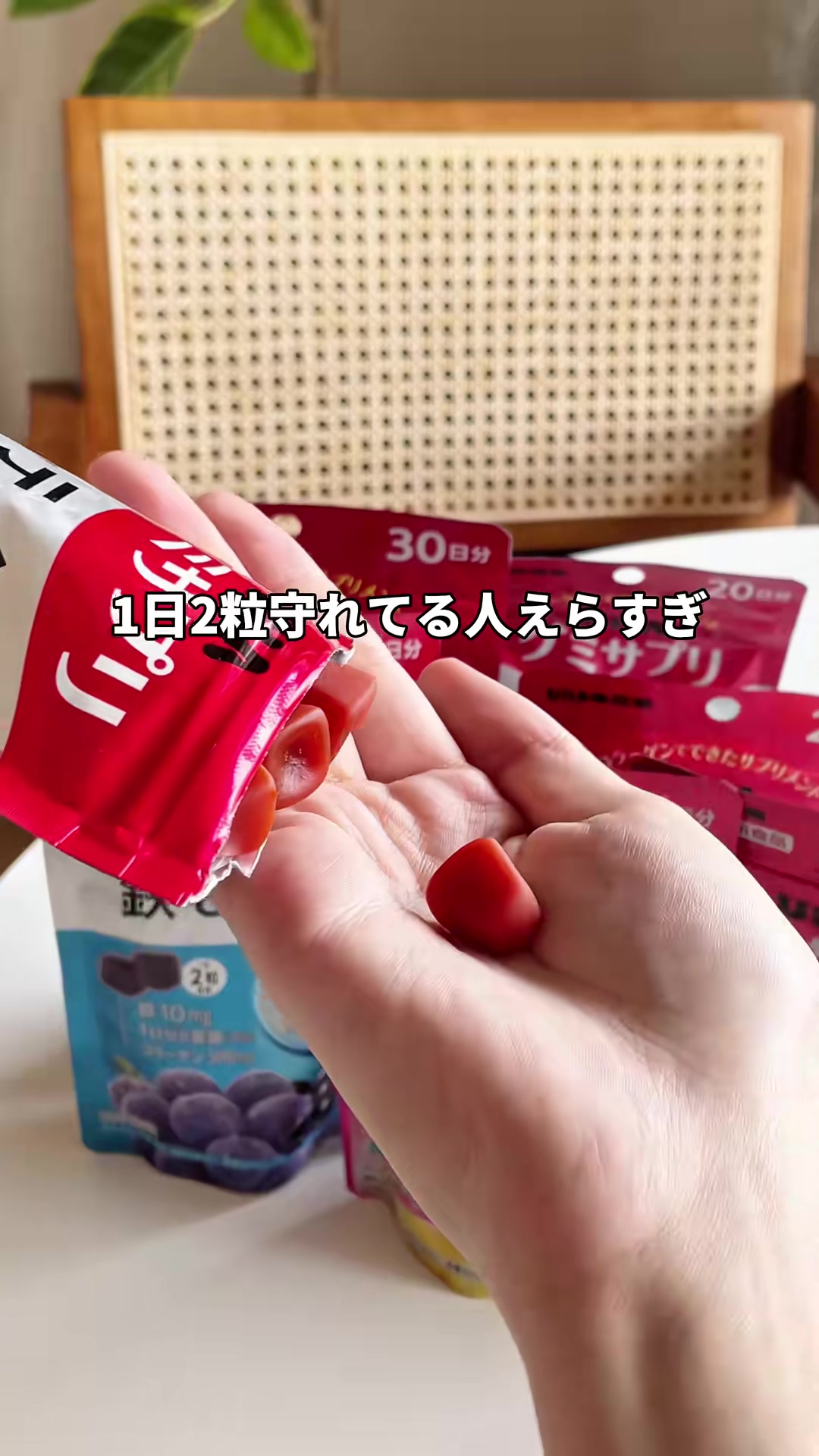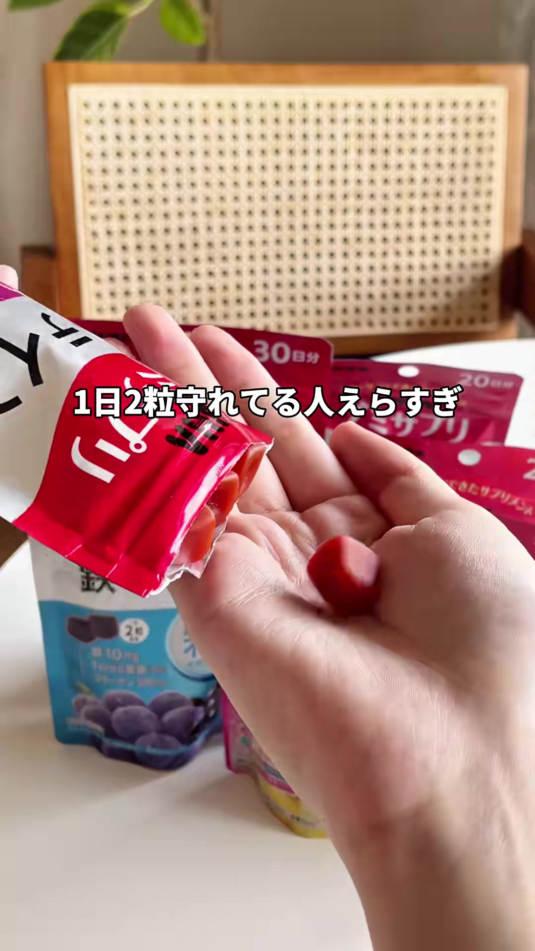 | 8-12秒 | 1粒のサプリを手に取る | 1日1粒でケア | 1日たった1粒で、目の健康をサポート。 | 手元クローズアップ。サプリの実物を撮影 or 提供素材。直切り。 | |