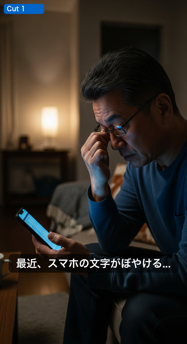 | 0-4秒 | スマホで孫の写真を見ようとするが見えない | 孫の写真がぼやけて... | 送られてきた孫の写真。でもぼやけてよく見えない... | スマホ画面にぼやけた子供の写真。切ないピアノBGM開始。手書き風テロップ。 | |